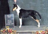 The "tri-color" is "predominantly black, carrying white markings as in a 'Sable and White' and has tan shadings on and about the head and legs."
